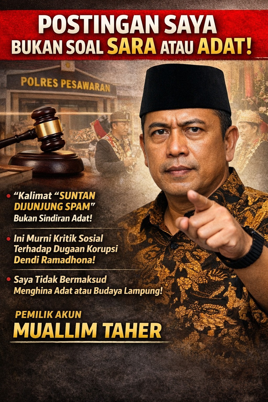Pesawaran — Pemilik akun Facebook Muallim Taher mengklarifikasi postingan miliknya yang ramai dibahas di media sosial dan dianggap menyinggung adat. Ia menegaskan postingan tersebut tidak berkaitan dengan suku, agama, ras, antargolongan (SARA), maupun adat istiadat apa pun. Senin (20/04/26)