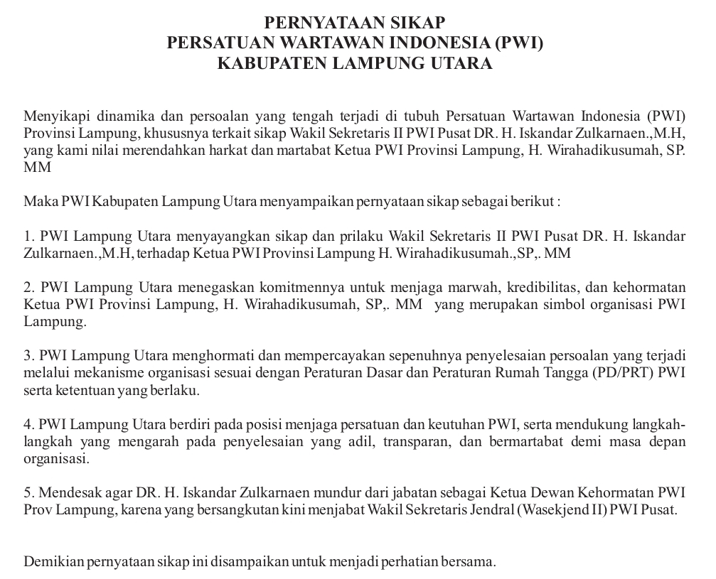 KOTABUMI – Pengurus Persatuan Wartawan Indonesia (PWI) Kabupaten Lampung Utara secara resmi mengeluarkan pernyataan sikap menanggapi dinamika internal yang tengah terjadi di tubuh PWI Provinsi Lampung.