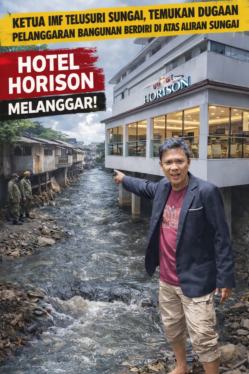 Bahkan, berdasarkan temuan di lapangan, salah satu bangunan yang diduga melanggar tersebut disebut mengarah pada Hotel Horizon, yang dinilai berdiri sangat dekat bahkan diduga berada di atas aliran sungai.